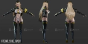 这是一款赛博朋克/奇幻风格下的未来主义精灵军官角色模型。模型为低多边形、游戏就绪状态,已绑定骨骼并包含PBR纹理,同时提供了裸体网格。支持UE5引擎。模型总三角面数为167640,单位厘米,含高跟鞋的模型高度为172厘米。FBX文件夹包含预设的完整套装和裸体组合FBX文件,以及用于单个部件的模块化FBX文件。模型包含完整的阴道和乳头细节。提供带有可玩蓝图的UE5项目文件、Blender源文件(Blender 5.0,使用Auto Rig Pro插件完全绑定,并包含用于切换服装部件的MustardUI)。纹理为PBR(金属度-粗糙度)流程,分辨率包括2048x2048和4096x4096,使用DirectX法线贴图,格式为.TGA(包含漫反射/高光/光泽度的备用纹理集)。此外,还包含Marmoset场景文件(含材质和工作室灯光设置)以及完整的角色模型Zbrush .ztl文件。