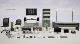 · 包含45个高品质办公物件,如办公桌椅、电脑(笔记本、显示器、键盘、鼠标)、打印机、绘图仪、灯具、书籍、文件夹、文具(铅笔、钢笔)、多种装饰植物和花瓶、画作、文件盘、地球仪、窗户等。